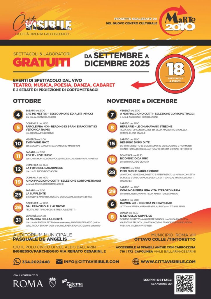 Ha preso il via lo scorso 24 settembre e proseguirà fino al 19 dicembre 2025 La città visibile, il grande progetto culturale ideato e realizzato da Marte 2010, promosso da Roma Capitale e vincitore dell’Avviso Pubblico per le iniziative di interesse dell’Amministrazione Capitolina in occasione del Giubileo 2025, in collaborazione con Zètema Progetto Cultura. L’iniziativa si svolge presso il Polo Civico di Viale Aldo Ballarin, nel Municipio VIII, e trasforma l’Auditorium Municipale Pasquale de Angelis in uno spazio vivo di arte, formazione e partecipazione.